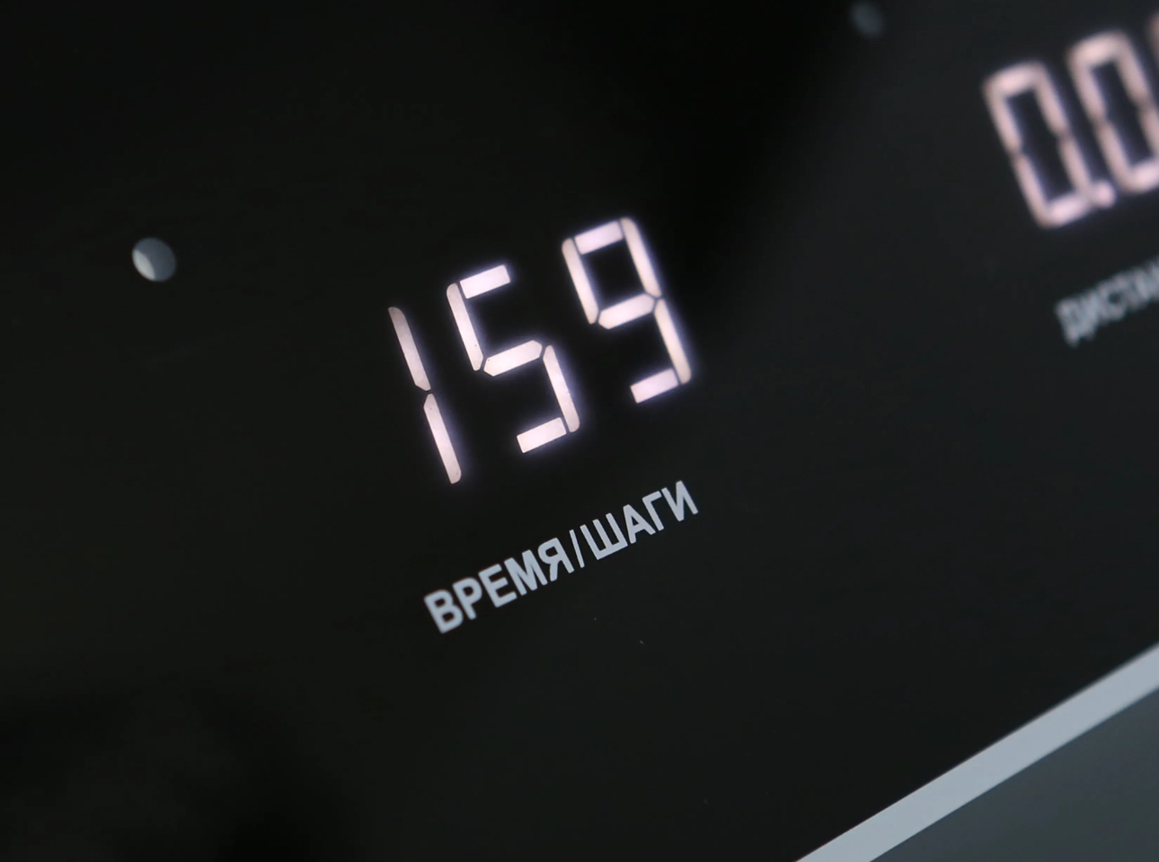 Показания консоли программный анимированный профиль, время, скорость, шаги, дистанция, калории, пульс, угол наклона, индикатор напоминания о необходимости смазки