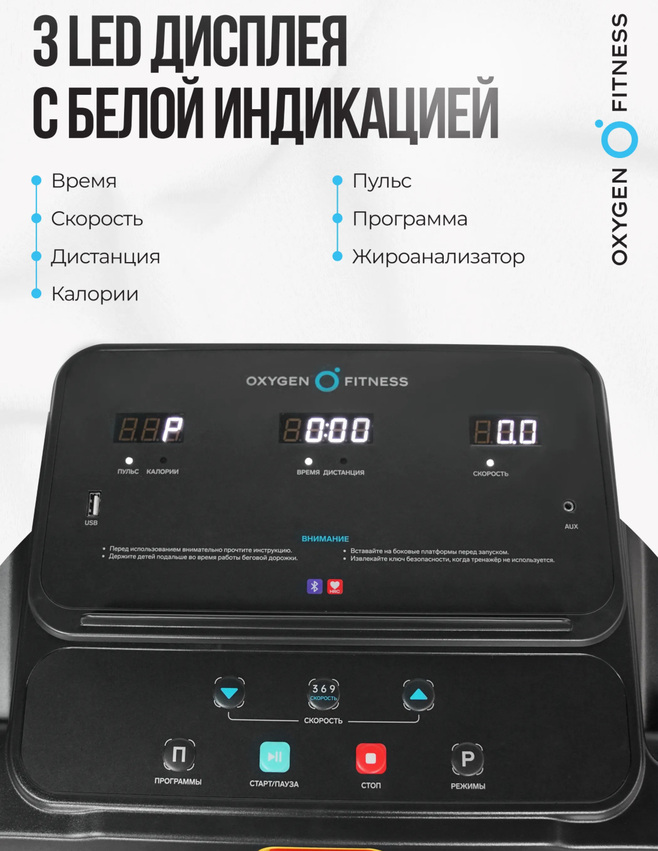 Показания консоли время, скорость, дистанция, калории, пульс, программа, жироанализатор