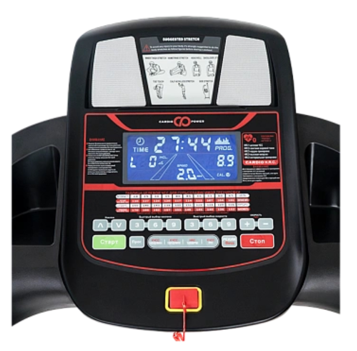 Показания консоли скорость / расстояние / время / наклон / частота пульса / калории / программы