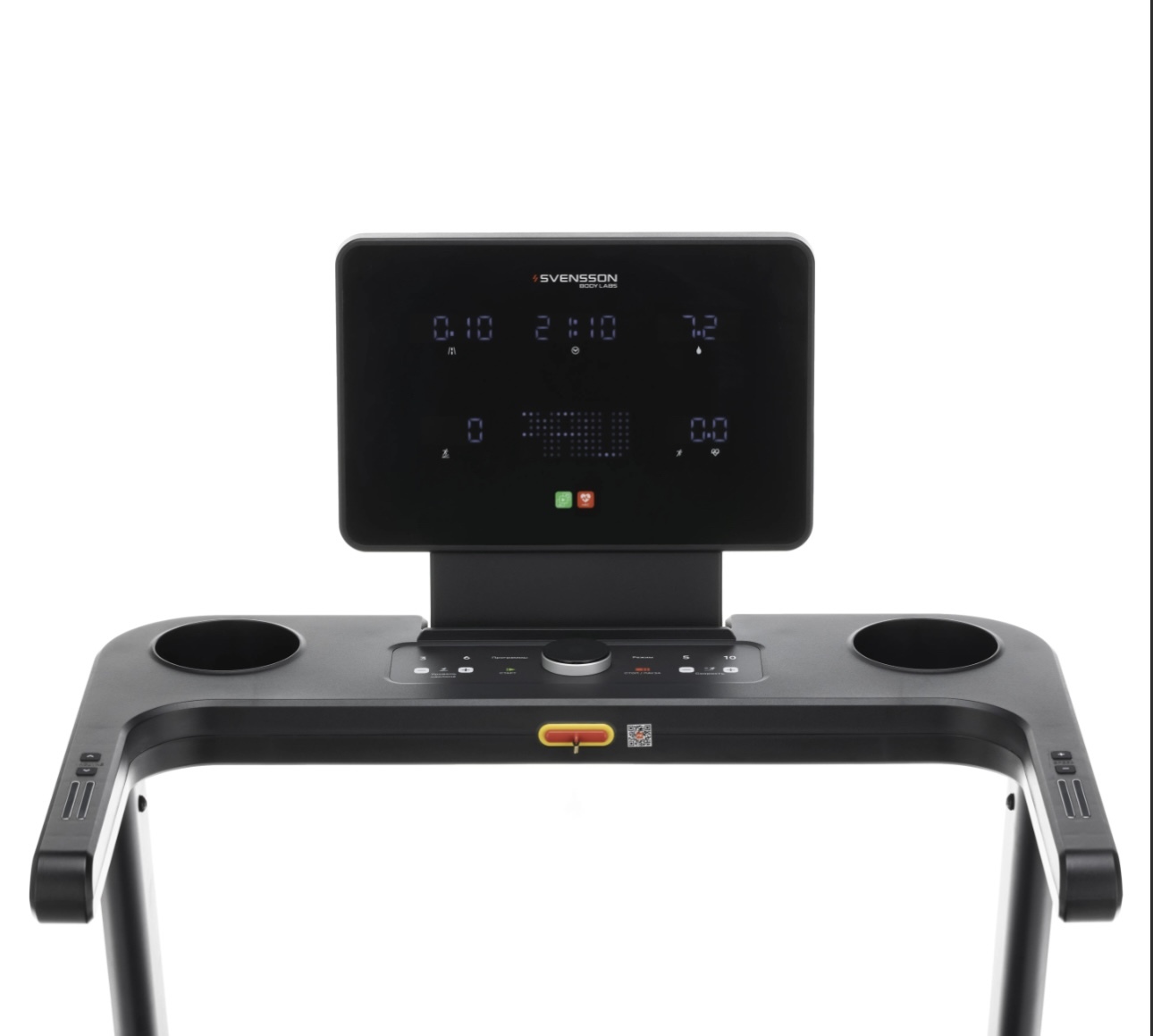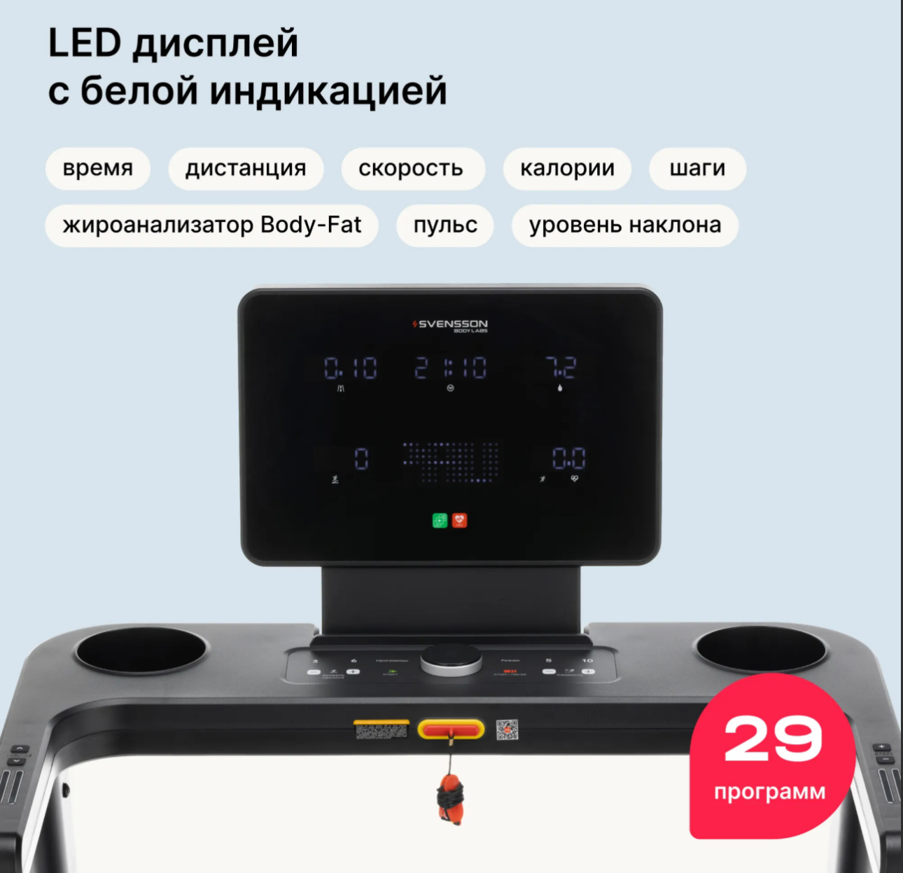 Показания консоли время, скорость, дистанция, уровень наклона, калории, пульс, шаги, жироанализатор, программа, статус Bluetooth