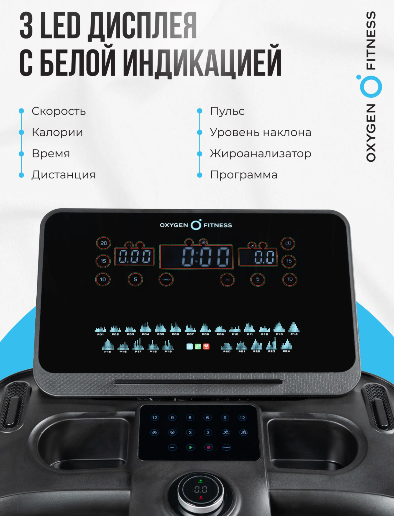 Показания консоли скорость, калории, время, дистанция, пульс, уровень наклона, жироанализатор, программа
