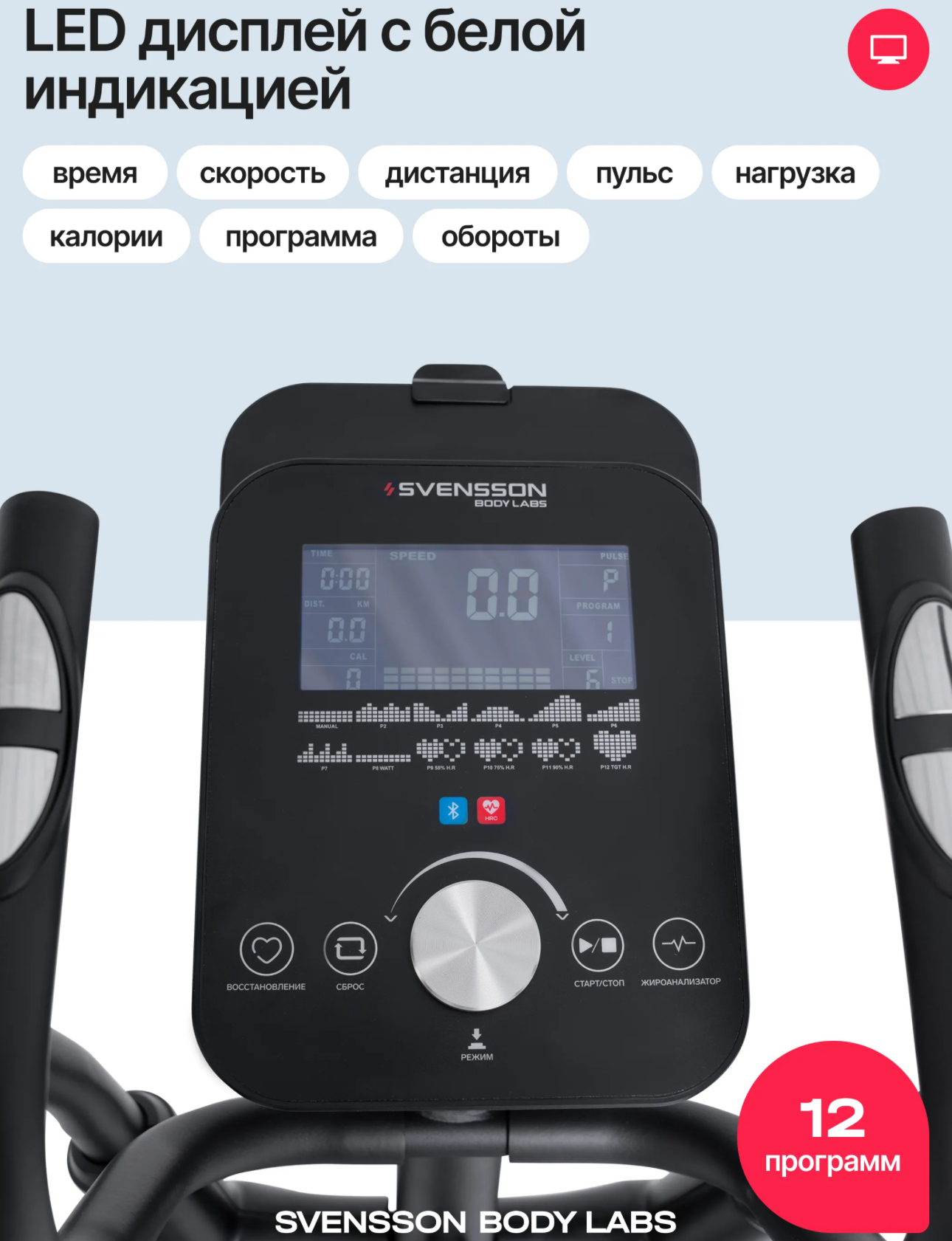 Показания консоли время, скорость, дистанция, пульс, уровень нагрузки, калории, программа, обороты
