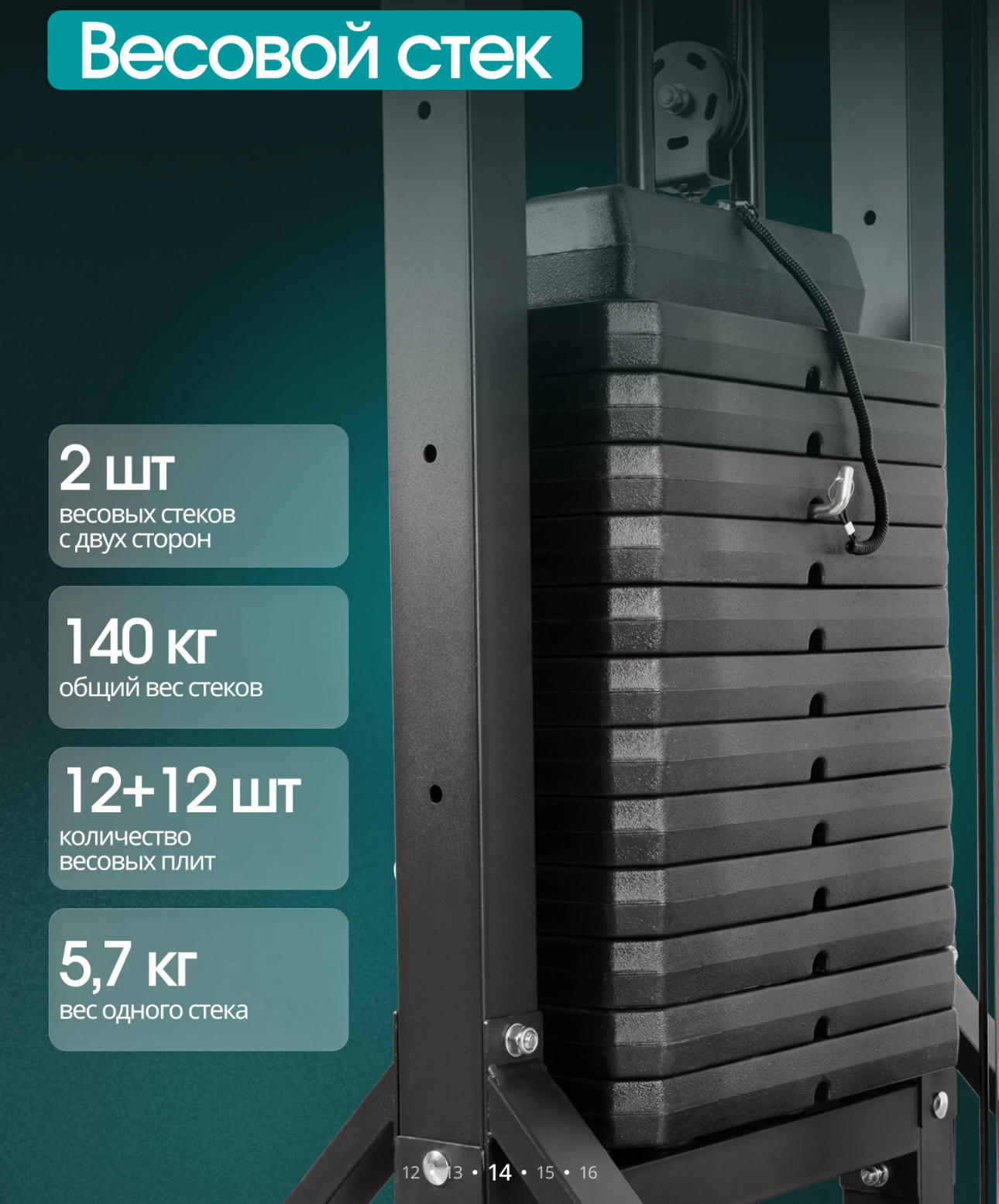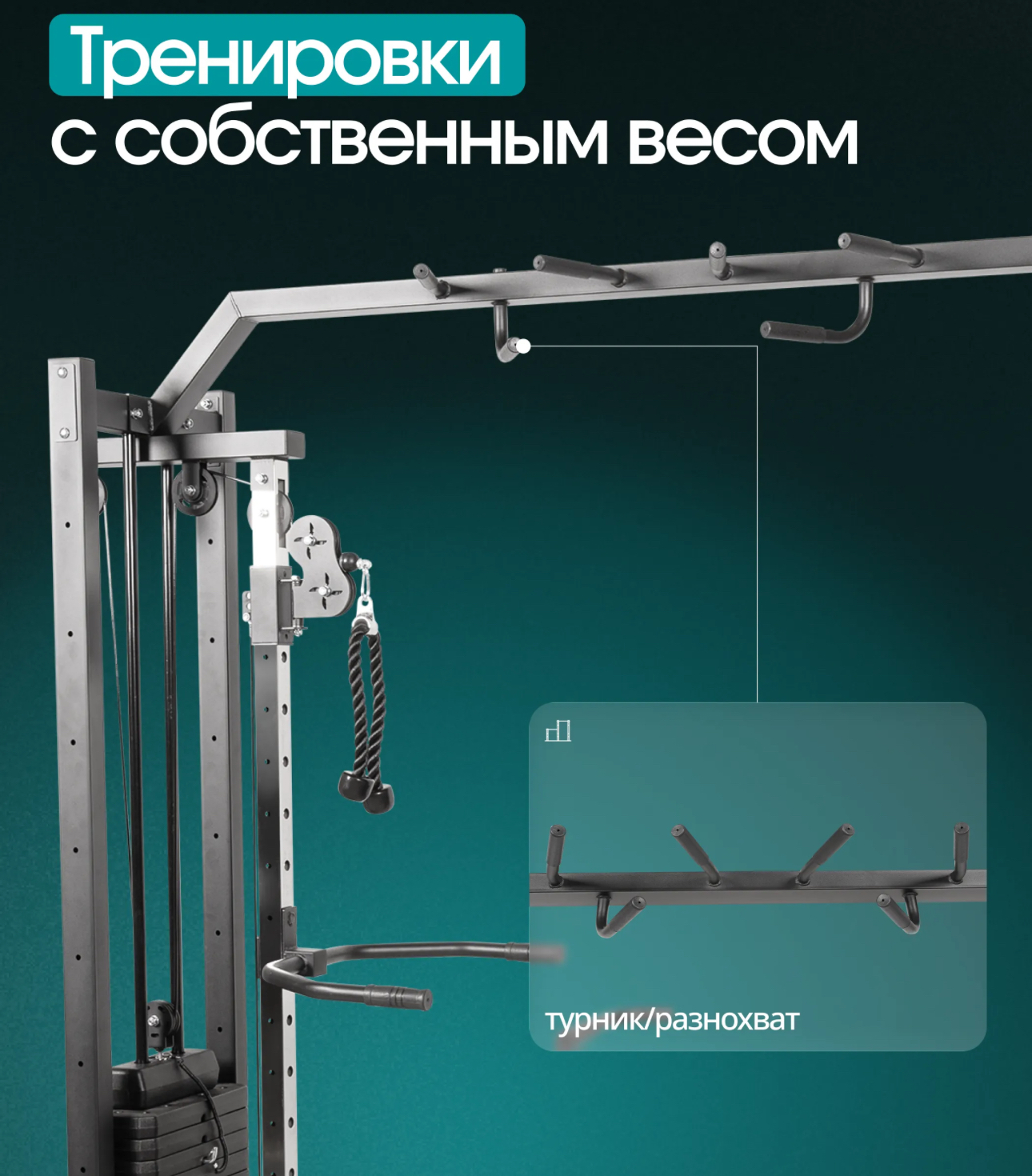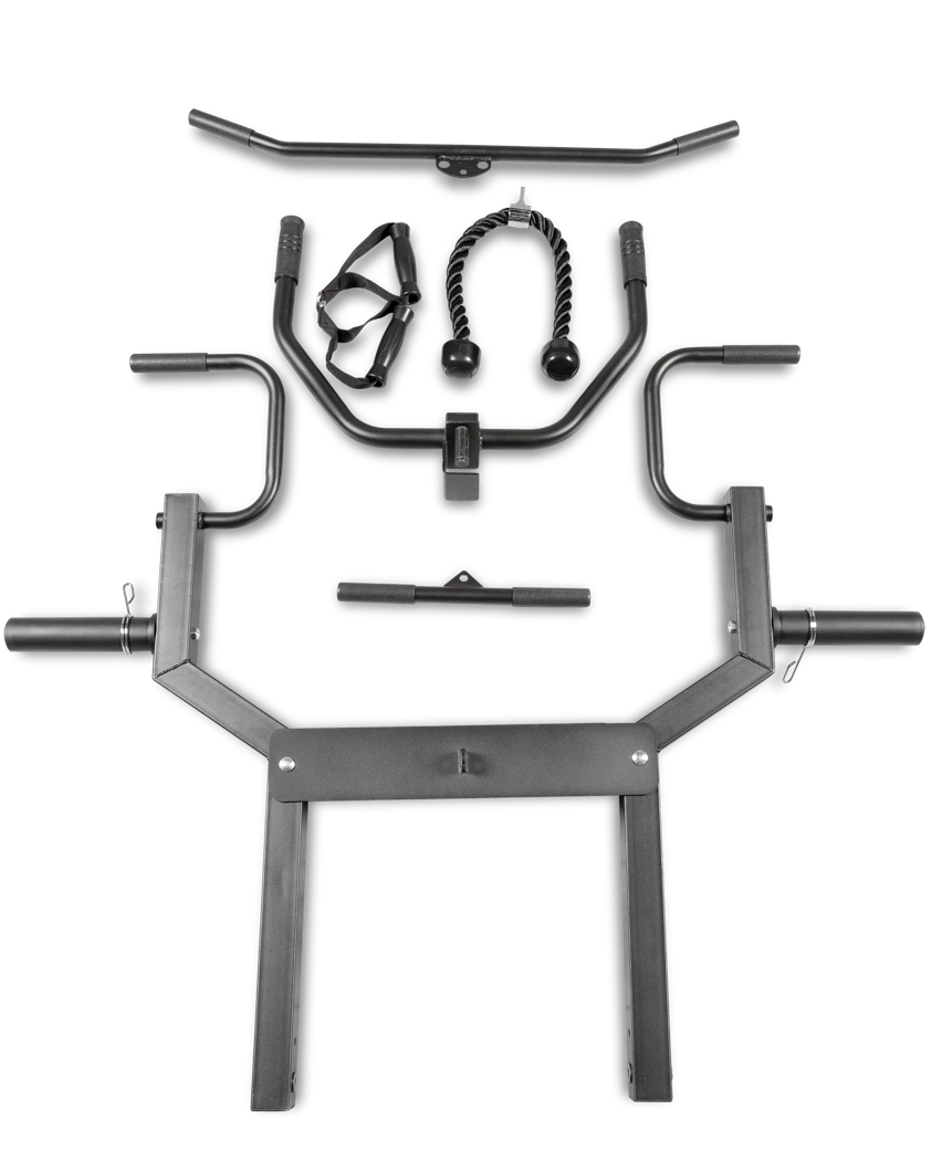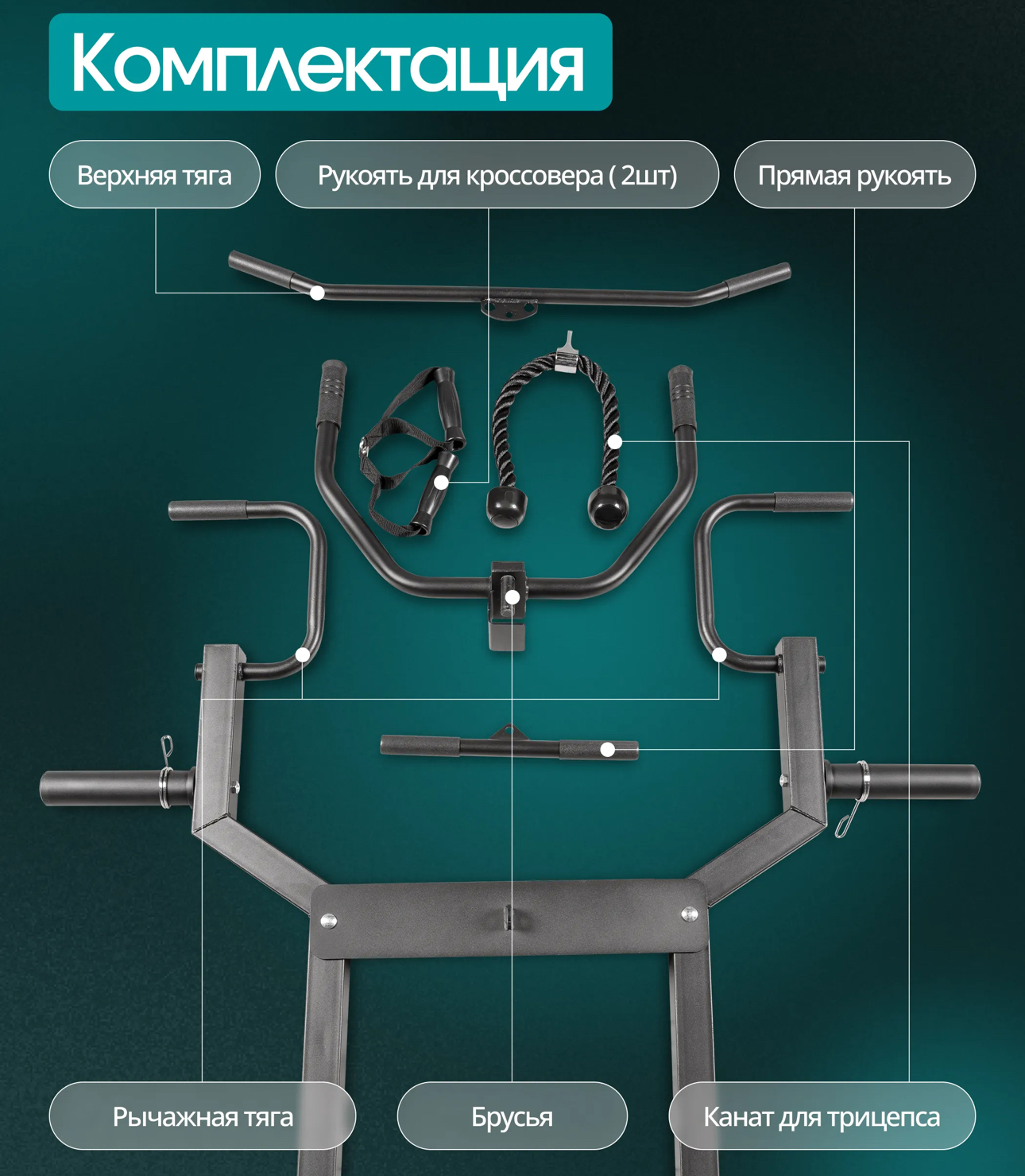 Дополнительно канат для трицепса, многофункциональный турник, многофункциональная рычажная тяга (регулировка по высоте - 8 ур.), брусья (регулировка по высоте - 15 ур, пружинные замки для дисков - 2 шт, накопители для дисков ф50 мм.