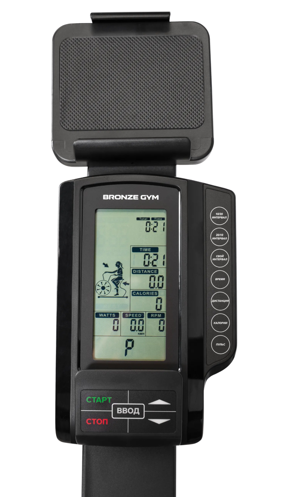 Показания консоли время, скорость, дистанция, калории, пульс, ватты, целевое время, интервал